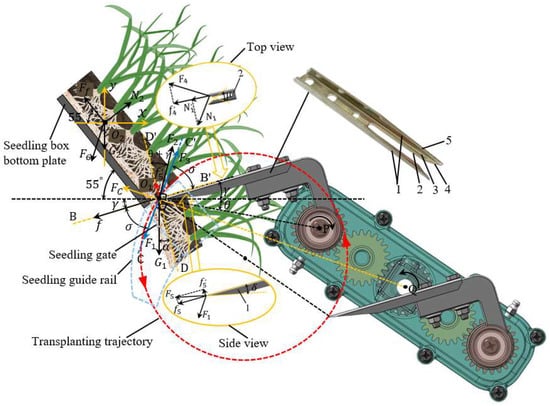 where F1 is the pushing force generated by the uniform rotation of the planetary gear around the sun gear, N; F2 is the cushioning force generated by the uniform self-rotation of the seedling needle around the center of the planetary gear, N; F3 is the tension force on the SB from the upper RBS, N; Fc is the Coriolis force generated by the relative motion of the planetary gear [], N; G1 is the gravity of the SB, N; f′5 is the component force of F5 in the direction of D-D′, , N; σ is the angle between B-B′ and C-C′, ; is the angle G1 between and D-D′,; is the angle between O1P and the horizontal line, ; and  is the picking angle, .