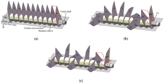 As shown in Figure 4a, the arrangement zone of the LSCs is divided into a cutter zone and a cutter-free zone, with the central cross-section of the cutter shaft serving as the boundary. The LSCs within the 180° circumferential range of the cutter zone are helically arranged at a specific CA. When LSCs are in contact with the root blanket, if the seedling box continues to feed seedlings longitudinally, the root blanket may be arched and stacked due to the excessive resistance of longitudinal seedling feeding. This study employed an intermittent cutting technique to prevent contact between the LSCs and the root blanket during longitudinal seedling feeding. During the longitudinal seedling feeding process, the central cross-section of the cutter shaft is parallel to the bottom plate of the seedling box. At this stage, the cutting zone exists beneath the seedling box’s bottom plate, ensuring no contact between the root blanket and the LSCs, representing the initial position. After the end of the longitudinal seedling feeding, the cutter shaft rotates a circle, and the LSCs in the cutting zone cut the root blanket above the bottom plate of the seedling box and return to the initial position. If the LSCs are uniformly arranged in a helical pattern within the cutter zone, the LSC number n and CA α must satisfy n = 180°/α + 1, and the circumferential 180° of the cutter shaft must be divisible by α. The angle between 0° and 30° is not considered, because there are too many LSCs engaged in cutting at the same time, so the possible CA values can only be 0°, 30°, 36°, 45°, 60°, and 90°. The reference angle is 0°, which needs to be included in the study. The number of LSCs with CA of 30°, 60°, and 90° arranged at the beginning of the contact with the root blanket is 2, 3, and 4, respectively. The more cutting phase synchronization, the greater the cutting torque, and the greater the impact force superposition; therefore, it is not recommended to choose 90°. This study selected three different CAs to arrange the LSCs, with CAs of 0°, 30°, and 60°. The core logic is also that the adjacent angle differences are completely consistent (both are 30°), which conforms to the principle of ‘arithmetic sampling’ and forms an arithmetic sequence of ‘0°→30°→60°’. The state of No.1 to 11 LSCs is consistent when the CA is 0° (Figure 4a). At a CA of 30°, No.1 to 7 LSCs are organized into a group positioned along a circumferential arc of 180°, followed by a similar arrangement for No.8 to 11 LSCs, which replicate the previous grouping (Figure 4b). When the CA is adjusted to 60°, No.1 to 4 LSCs are grouped along a circumferential arc of 180°, after which No. 5 to 8 and 9 to 11 LSCs are similarly grouped to mirror the earlier configuration (Figure 4c).