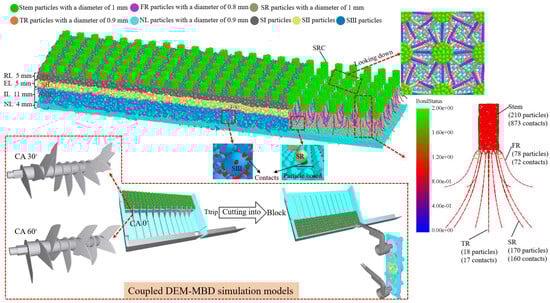 The computer configuration used for the simulation was an Intel (R) Core(TM) i9-275HX (2.70 GHz) CPU with 32.0 GB of RAM, 24 cores, and an RTX 5070 Ti independent graphics card. Approximately eight hours were required to simulate 1 s of the root blanket longitudinal cutting process, and 10 h were required to simulate 0.2 s of the root blanket strip (RBS) lateral cutting process. The EDEM and RecurDyn time steps were set to 4.5 × 10−6 s and 1 × 10−2 s, respectively.