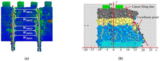 It is difficult to collect the data in the cutting gap between RBSs because it is very narrow, and the RBS is flexible and easy to deform. The vibration during cutting greatly disturbs the size of the cutting gap. Therefore, WRBS can be used instead of the disturbance width of the cutting gap as the evaluation indicator of cutting performance. As shown in Figure 6a, the contour on both sides of the RBS generated by LSCs was derived from the instantaneous particle velocity cloud image. WRBS was determined by measuring the distance between the contour particles on both sides of the RBS using the “Ruler” tool. The average value was calculated by taking five random measurements for each RBS. After the seedling needle laterally cut the RBS, ten measurement points were randomly taken on the contour of the fracture surface of the SB formed. A right-angle coordinate system was established, with the center of the SB bottom as the coordinate origin. The coordinate values of each point were measured using the “Ruler” tool, and the obtained coordinate values were fitted (Figure 6b) to obtain KSB.