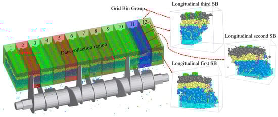 After the simulation of the seedbed, the soil breakage rate [] and straw breakage rate [] can be characterized by the number of breaks of the soil and straw bonds, respectively. Based on these studies, the Geometry Box function in the post-processing module of EDEM was employed. Upon stabilization of the cutting area, a designated data collection region was established to quantify the number of contacts within this region before and after the cutting process, excluding stem particles’ contacts. For longitudinal cutting, 12 measurement grids of 19 × 70 × 35 mm (width, length, and height) were set up in the root blanket region. Each measurement grid corresponded to one RBS, with the measurement grid demarcation line located in the center of the cutting gap (Figure 7). After the RBS was cut laterally into three SBs, 25 × 38 × 30 mm (width, length, height) measurement grid was set up in each SB area, respectively (Figure 7). It should be noted that in EDEM, to distinguish the Hertz–Mindlin with bonding contact model, the HMB V2 contact model is post-processed with “contact” for “bond”. MRBS and MSB obtained from the simulations were calculated using Equations (8) and (9), respectively, and SRBS and MSB were calculated using Equations (10) and (11), respectively.