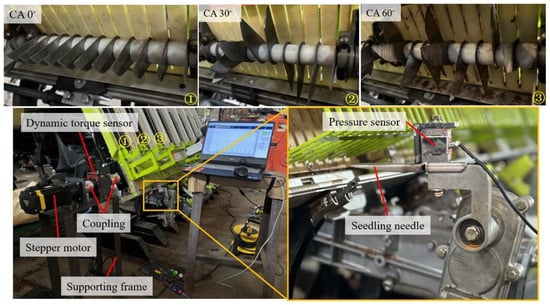 A rice blanket seedling root blanket longitudinal cutting and lateral cutting test platform was designed and manufactured, which mainly consists of a stepping motor, a DYN-200 dynamic torque sensor with a range of 200N-m (Bengbu Dayang Sensing System Engineering Co., Ltd., Bengbu, China), a JLBS-M2 pressure sensor with a range of 500 N (Bengbu Sensor System Engineering Co., Ltd., Bengbu, China), and a supporting frame (Figure 8). The data acquisition frequency of the two sensors was 1000 times/s. The LSCs arranged at three CAs were located in the three rows on the leftmost side of the seedling box, from left to right: 0°, 30°, and 60°. The dynamic torque sensor was used for real-time measurement of the stepper motor longitudinal cutting output torque, and its two ends were connected to the stepper motor and the LSC shaft through couplings, respectively. The pressure motor was mounted on the seedling needle to measure lateral cutting resistance in real time. Each torque or force result was the maximum value of the recorded data curve.