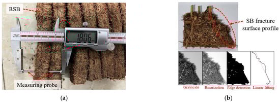 was measured by an external groove digital vernier caliper (Figure 9a). Each RBS was randomly measured five times, and finally, the average of all measured values was taken. As shown in Figure 9b, the fracture surface contour of the SB was captured with a camera, and the obtained image was digitally processed using Matlab (R2018b). Grayscale, binarization, edge detection, and linear fitting were performed, respectively, and finally, KSB was obtained. Each set of tests was repeated three times, and the average value was calculated.