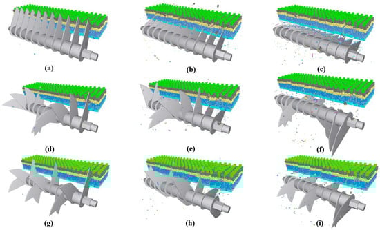 The number of cutters when the LSCs arranged at CAs of 0°, 30°, and 60° started to contact the root blanket at the beginning stage was eleven, two, and three, respectively (Figure 10a,d,g). As the cutter shaft continued to rotate, the LSCs applied pressure and generated a sliding cutting action on the root blanket, causing it to deform flexibly until the fracture occurred. As shown in Figure 10b,e,h, the maximum number of cutters engaged in cutting for the LSCs arranged at the three CAs was eleven, four, and three, respectively. The more LSCs simultaneously engaged in sliding cutting, the greater the disturbance to the root blanket, resulting in more extensive breakage of both the substrate and the roots. Due to the friction between the LSCs and the root blanket, at the end of the longitudinal cutting, some broken free substrate and root particles were brought out of the cutting gap by the LSCs (Figure 10c,f,i).