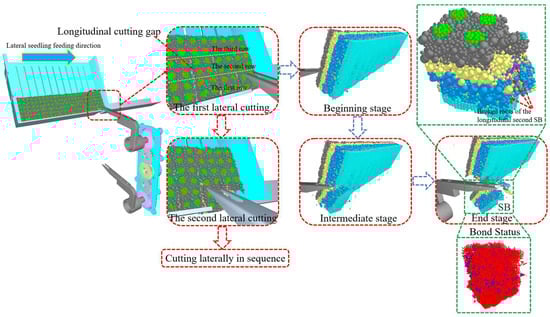 The root blanket being cut into the SB process of longitudinal cutting (Figure 10) and lateral cutting (Figure 11) operations was simulated using the established DEM flexible model of the root blanket, with three CA arrangements of LSCs with a sliding angle of 45° and a cutter shaft speed of 60 r/min, seedling needle with a picking angle and width of 5° and 14 mm, respectively, and a rotary gearbox with a speed of 200 r/min. Simulations were conducted to analyze the dynamic properties during longitudinal cutting and lateral cutting, and the simulation results were consistent with the physical tests, indicating that the HMB V2 contact model accurately simulated the flexibility and breakability of the root blanket, and the JKR V2 contact model accurately simulated the adhesion between the roots and the substrate.