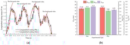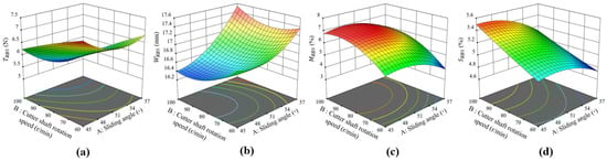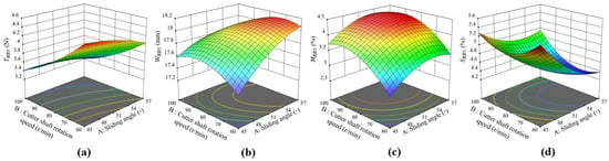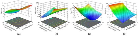 - In the longitudinal cutting simulation, the effects of different sliding angles and cutter shaft speeds on the performance of the three CA arrangements of the LSCs were investigated. The simulation tests were designed using the CCD method, with the levels of sliding angle (A) and cutter shaft speed (B) determined as shown in Table 1. The effects of the two factors and their interaction on the evaluation indicators of the maximum longitudinal cutting torque (TRBS), the RBS width (WRBS), the RBS breakage rate (MRBS), and the RBS root injury rate (SRBS) were analyzed.