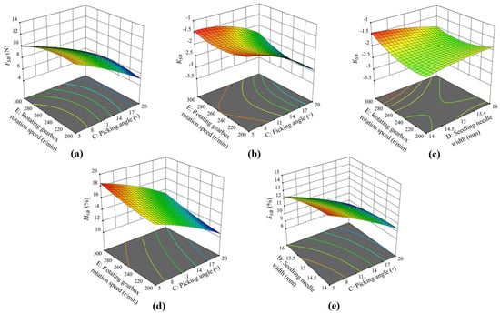 - When optimizing the working parameters of RBS lateral cutting, the picking angle (C), seedling needle width (D), and rotary gearbox speed (E) were considered, as detailed in Table 1. The simulation tests were conducted using the BBD method, employing the maximum lateral cutting resistance (FSB), the SB fracture surface contour fitting line slope (KSB), the SB breakage rate (MSB), and the SB root injury rate (SSB) as evaluation indicators. Regression models were established to determine the optimal parameter combinations.