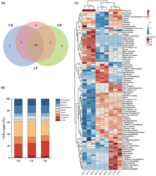 The VOCs analysis of different fermentation treatments in WPMS. (a) Venn diagram of VOCs in different silage treatments; (b) Different in VOCs types among silage treatments; (c) Heatmap of cluster analysis for VOCs in different silage treatments. CK: no addition; LP: screened Lentilactobacillus plantarum; LB: screened Lentilactobacillus buchneri.