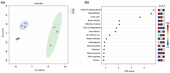 (a) PCA score plot of VOCs in WPMS under different treatments; (b) VIP scores plot of VOCs in WPMS under different treatments. CK: no addition; LP: screened Lentilactobacillus plantarum; LB: screened Lentilactobacillus buchneri.