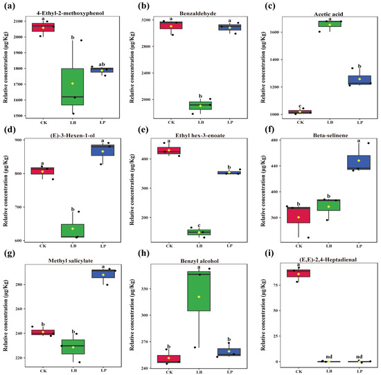 Boxplots of VOCs with VIP >1 in WPMS. (a) 4-Ethyl-2-methoxyphenol; (b) Benzaldehyde; (c) Acetic acid; (d) (E)-3-Hexen-1-ol; (e) Ethyl hex-3-enoate; (f) Beta-selinene; (g) Methyl salicylate; (h) Benzyl alcohol; (i) (E, E)-2,4-Heptadienal. CK: no addition; LP: screened Lentilactobacillus plantarum; LB: screened Lentilactobacillus buchneri. Different lowercase letters indicate significant differences between treatments (p < 0.05); nd: not detected. Black dots represent three biological replicates.