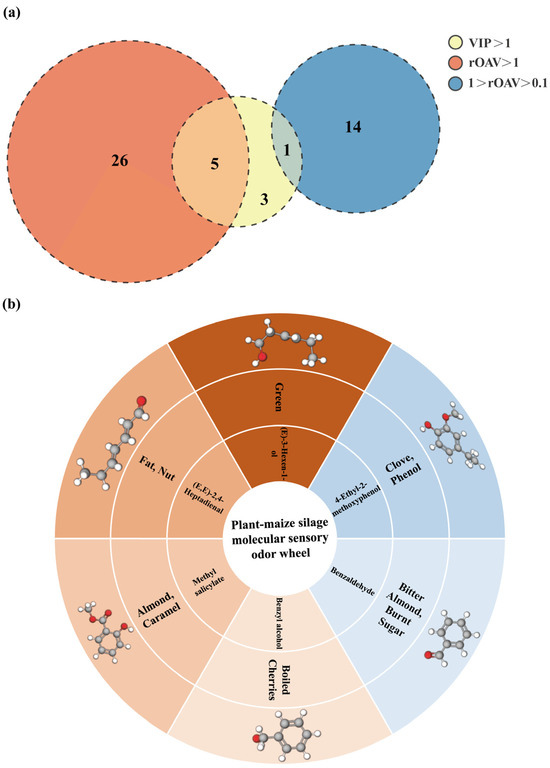 (a) Venn diagram indicating the number of VOCs with VIP > 1, rOAV > 1, 1 > rOAV > 0.1; (b) Molecular sensory odor wheel of 6 key VOCs with VIP > 1 and rOAV > 0.1 in WPMS. Red indicates compounds that positively contribute to the overall aroma, while blue indicates compounds that negatively contribute to the overall aroma.