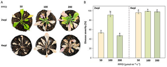 The occurrence of bacterial wilt in Arabidopsis thaliana grown under different light intensities. To assay the disease occurrence, four-week-old (A) thaliana plants grown under 50, 100, or 200 PPFD of light intensity were transplanted into diseased soil containing Ralstonia solanacearum Rd15. Panel indicates the symptoms of bacterial wilt at 2- and 4-week post-inoculation (wpi). Panel (B) indicates the disease severity of bacterial wilt. Different letters above the columns indicate significant differences between plants from distinct light intensities based on Tukey’s HSD test (p < 0.05).