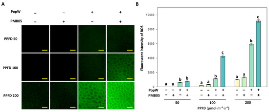 Effect of PopW-mediated rapid reactive oxygen species (ROS) generation in Arabidopsis thaliana plants grown under different light intensities. Four-week-old A. thaliana Col-0 plants that had been cultivated under 50, 100, or 200 PPFD were used in this assay. ROS generation was induced with 0.5 μM PopW in the presence or absence of Bacillus amyloliquefaciens PMB05. Panel (A) shows representative images of ROS generation (scale bar = 20 μm). Panel (B) presents the quantification of ROS fluorescence intensity. The symbols “−” and “+” indicate whether or not the treatment contained PopW or PMB05, respectively. Different letters indicate significant differences among plants grown under different light intensities, as determined by Tukey’s HSD test (p < 0.05).