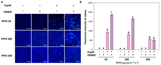 Effect of PopW-mediated callose deposition in Arabidopsis thaliana plants grown under different light intensities. Four-week-old A. thaliana Col-0 plants that had been cultivated under 50, 100, or 200 PPFD were used in this assay. Callose deposition was induced with 0.5 μM PopW in the presence or absence of Bacillus amyloliquefaciens PMB05. Panel (A) shows representative images of callose deposition (scale bar = 20 μm). Panel (B) presents the quantification of callose deposition intensity. The symbols “−” and “+” indicate whether or not the treatment contained PopW or PMB05, respectively. Different letters indicate significant differences among plants grown under different light intensities, as determined by Tukey’s HSD test (p < 0.05).