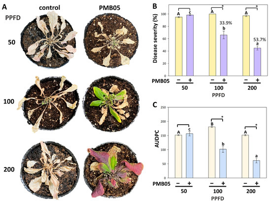Effects of Bacillus amyloliquefaciens PMB05 on the control of bacterial wilt in Arabidopsis thaliana grown under different light intensities. Four-week-old A. thaliana Col-0 plants cultivated under 50, 100, or 200 PPFD were pretreated with PMB05 and, two days later, transplanted into soil infested with Ralstonia solanacearum Rd15. Panel (A) shows bacterial wilt symptoms at 4 weeks post-inoculation (wpi) with or without PMB05 treatment. Panel (B) presents disease severity at 4 wpi. Panel (C) shows the area under the disease progress curve (AUDPC) calculated from disease severity between 2 and 4 wpi. The symbols “−” and “+” denote absence or presence of PMB05 treatment, respectively. Asterisks (*) above bars indicate significant differences from the untreated control by t-test (p < 0.05). Different lowercase and uppercase letters represent significant differences among plants grown under different light intensities based on Tukey’s HSD tests.