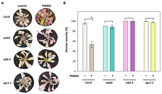 Effects of Bacillus amyloliquefaciens PMB05 on the control of bacterial wilt in salicylic acid pathway mutants of Arabidopsis thaliana grown under high light intensity. Four-week-old A. thaliana Col-0 and its SA pathway mutants nahG, sid2-5, and npr1-1 were cultivated at 200 PPFD, pretreated with PMB05 bacterial suspensions, and transplanted two days later into soil infested with Ralstonia solanacearum Rd15. Panel (A) shows bacterial wilt symptoms at 4 weeks post-inoculation (wpi) with or without PMB05 treatment. Panel (B) presents disease severity at 4 wpi. The symbols “−” and “+” denote absence or presence of PMB05 treatment, respectively. Asterisks (*) indicate significant differences compared to the untreated control by t-test (p < 0.05).