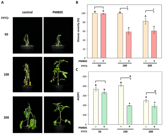 Evaluation of Bacillus amyloliquefaciens PMB05 on the biocontrol of bacterial wilt in tomato plants grown under different light intensities. Four-week-old tomato plants cultivated under 50, 100, or 200 PPFD were pretreated with PMB05 and, two days later, transplanted into soil containing Ralstonia solanacearum Ps152. Panel (A) shows bacterial wilt symptoms at 10 days post-inoculation (dpi) with or without PMB05 treatment. Panel (B) presents disease severity at 10 dpi. Panel (C) displays the area under the disease progress curve (AUDPC), calculated from disease severity between 5 and 10 dpi. The symbols “−” and “+” denote absence or presence of PMB05 treatment, respectively. Asterisks (*) above bars indicate significant differences from untreated controls by t-test (p < 0.05). Different lowercase and uppercase letters indicate significant differences among plants grown under different light intensities within each treatment based on Tukey’s HSD tests.