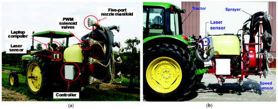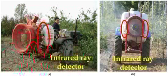 Diagram of devices equipped with infrared sensors. (a) Automatic target detecting orchard sprayer with infrared sensors [24]; (b) automatic toward-target sprayer with infrared sensors [26].