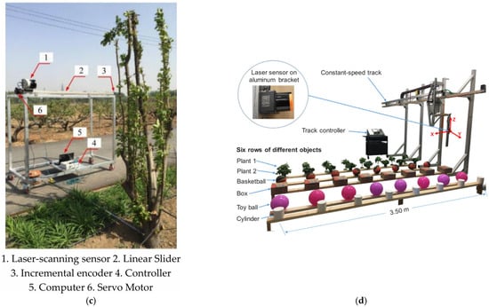 Diagram of devices equipped with laser scanning sensors. (a) The variable-rate sprayer based on the LMS291 laser scanning sensor [18]; (b) the position of the laser sensor on the vehicle [19]; (c) a structure diagram of the laser-scanning system [20]; (d) the 270° radial range laser sensor mounted on a constant-speed track [21,22].