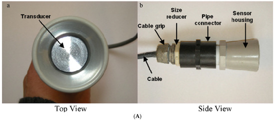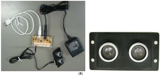 Diagram of ultrasonic sensors. (A) LV-MaxSonar-WR1 ultrasonic sensor with protection components [28]; (B) USS3 ultrasonic sensor with connection board [29].