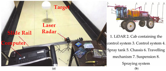 Diagram of some devices equipped with radar sensors. (a) System of target test [32]; (b) structure diagram of high-clearance sprayer [33].