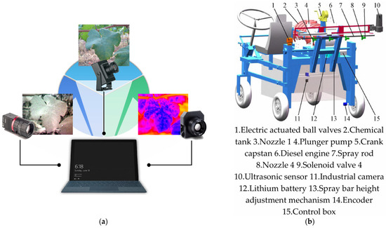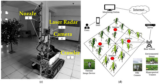 Diagram of multi-source fusion sensor systems. (a) Image collection system: Multispectral (MS), RGB, and thermal infrared (TIR) cameras are connected to a portable computer through data lines. Additionally, the multispectral image (MSI), RGB image (RGBI), and thermal infrared image (TIRI) were collected by corresponding cameras controlled by the computer [43]. (b) Schematic diagram of sprayer structure equipped with multi-source sensors [44]; (c) diagram of detection system [45]; (d) visual representation of multi-sensor system [46].