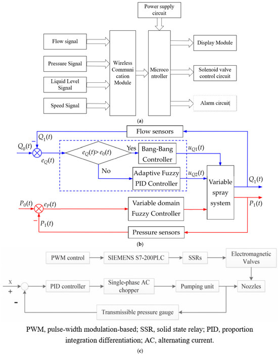 Diagram of some control systems with different compositions. (a) Diagram of variable-rate herbicide spraying controller [75]; (b) diagram of variable-rate spray on double closed-loop [82]; (c) schematic principle of constant-pressure control system [83].