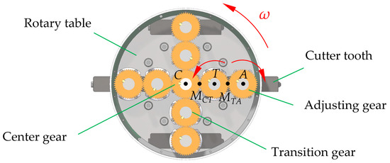 Given that the transition gear and the adjusting gear rotate synchronously with the rotary table, they exhibit identical angular velocities of rotation, denoted as ωCT = ωCA = ω. By incorporating this relationship into Equation (1), when the pitch circle radius of the center gear and the adjusting gear are equal, both gears possess the same angular velocity. Furthermore, since ωC equals zero, the phase angle of the cutter tooth assembly remains constant throughout the operation.