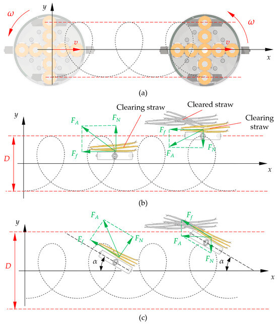 The cutter teeth clean the straw on the seeding belt according to the trochoid trajectory. The trochoid motion trajectory of a single cutter tooth is shown in Figure 3a. To investigate the effect of the deflection angle of the cutter tooth group (DA) on the removal of straw from the seeding belt, force analyses were conducted on the straw both during its movement and at the nodes where the straw is removed, as shown in Figure 3b,c. The straw is mainly subjected to the friction force Ff from the cutter teeth and the support force FN. The object providing the support force FN varies at different stages. Specifically, when the cutter teeth drive the straw to move toward the side of the seeding belt, FN is mainly provided by the cutter teeth. When the straw reaches the maximum y-value and the cutter teeth begins to move in the negative y-direction, away from the straw, FN is mainly provided by the already cleared straw. During the movement of the straw influenced by the cutter teeth, the resultant force FA acting on the straw, arising from the combined effects of Ff and FN, is directed toward posterolateral of the VFD under both conditions of DA = 0 and DA ≠ 0. This orientation facilitates the effective removal of the straw from the seeding belt. When the straw is about to be cleared from the seeding belt, under the DA = 0 condition, Ff points in the negative x-axis direction. Under the action of the normal force FN, the resultant force FA on the straw also points in the negative x-axis direction, which may cause the cleared straw to return to the seeding belt, resulting in a decrease in the straw cleaning rate. Under the DA ≠ 0 condition, DA alters the direction of the friction force Ff exerted by the cutter teeth on the straw, thereby adjusting the movement trend of the straw. Additionally, the DA (α) contributes to an increase in the width D of the straw cleaning zone, evidenced by Equation (3). The interplay of these factors collectively influences the overall performance of the VFD.