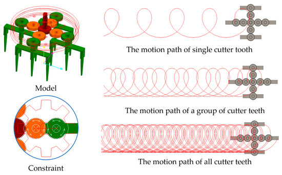 During the operation of the VFD, the cutter teeth follow a cycloidal trajectory to effectively sever the soil and straw. The overall efficiency of the straw cleaning process is determined by the combined trajectories of multiple cutter teeth. Therefore, the trajectories of the cutter teeth were initially analyzed using RecurDyn software. Prior to this analysis, the simulation model of the VFD was simplified in SolidWorks 2018 by removing non-essential components, such as bolts and keys. The resulting simplified model was then imported into RecurDyn, where appropriate constraints—including revolute pairs, translate pairs, and gear pairs—were applied, along with the integration of rotational and translational power sources. Theoretical analysis indicates that the trajectory of the cutter teeth is determined by the combined effects of the OS and RS. Based on the previous studies, it is recommended that the OS is set at 2.0 m/s, with the RS maintained at 300 r/min. Figure 4 depicts the cutter trajectories for a single tooth, a group of teeth, and all teeth when α is zero.
