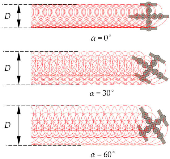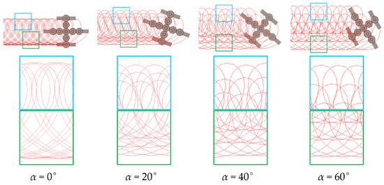 To examine the influence of the DA on the motion trajectory, simulations were performed with α values of 0°, 30°, and 60°. The corresponding results are presented in Figure 5. The analysis demonstrates that the working width D exhibits a substantial increase as parameter α rises, corroborating prior theoretical derivations. With a constant number of cutter teeth, the average area covered by each individual tooth correspondingly increases, leading to a reduction in the density of the cutting path distribution. Notably, at the lateral edges of the straw cleaning zone, the inadequate coverage by a single tooth leads to a localized decrease in straw cleaning efficiency.