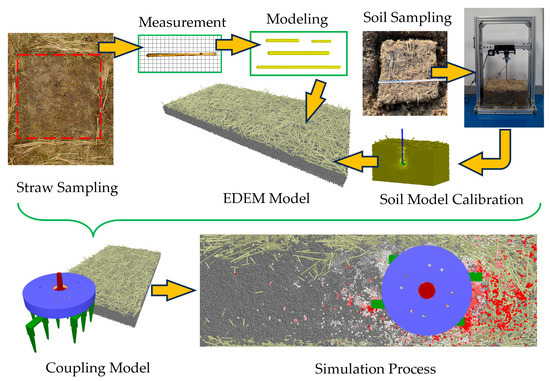Based on the actual measurement results of straw, multiple spherical particles were bonded together to construct a simulation model of rice straw, which was evenly spread over the seeding belt surface at a coverage of 1.77 kg/m2 according to the actual test value. Finally, the VFD model was imported into the geometry module of EDEM through the External SPI module of RecurDyn. The final coupled simulation model and simulation process are shown in Figure 6 [32,33].