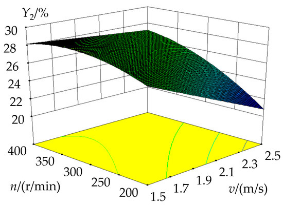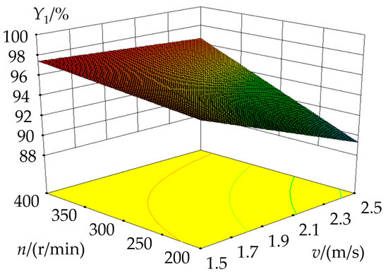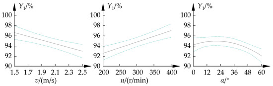 An analysis of variance was conducted on the experimental data utilizing Design Expert 8.0.6 software. The results pertaining to the equation analysis of factors influencing the straw cleaning rate are presented in Table 5. The factors were ranked in terms of their impact on the straw cleaning rate as follows: n, v, α2, α, the interaction term v-n, the interaction term n-α, n2, v2, and the interaction term v-α. Notably, the variables n and v exhibited a highly significant effect on the straw cleaning rate (p < 0.01). The squared term α2 demonstrated a significant effect (0.01 < p < 0.05), while α and the interaction term v-n showed a moderately significant effect (0.05 < p < 0.1). Conversely, the interaction term n-α, along with n2, v2, and the interaction term v-α, did not exert a statistically significant influence on the measured experimental outcomes (p > 0.1). The analysis of variance revealed that the lack-of-fit term for the regression model is not statistically significant (p = 0.1706), suggesting a meaningful quadratic relationship between the experimental factors and the response variable. Consequently, by excluding the non-significant factors, the resulting regression equation is presented in Equation (5).