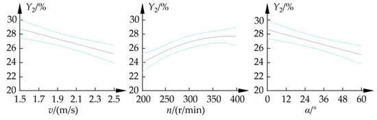 Figure 10 presents the single-factor influence analysis derived from the regression equation. The findings reveal that the soil disturbance rate declines in an approximately linear manner as both the OS and the DA increase. Conversely, the soil disturbance rate demonstrates a nonlinear pattern with respect to RS, initially rising before reaching a plateau. This behavior can be attributed to the fundamental mechanism whereby soil disturbance primarily results from the cutting action of the teeth on the soil. Specifically, as the OS increases, the contact duration between the teeth and the soil per unit area decreases linearly, thereby diminishing the extent of plastic deformation within the soil. Regarding the initial increase in RS, this increases the impact of the cutter tooth’s kinetic energy on the soil. Nevertheless, owing to the soil’s rheological stress characteristics, the rate of disturbance stabilizes at a higher RS. The reduction in the soil disturbance rate attributed to the DA primarily operates through two mechanisms: firstly, an increase in DA substantially broadens the straw cleaning width (with α = 60° showing a 57.7% increase relative to 0°), thereby expanding the soil disturbance measurement area and consequently diluting the disturbance intensity per unit area; secondly, augmenting DA increases the spacing between cutting trajectories, which decreases the frequency of cuts per unit area and directly diminishes the overall soil disturbance intensity.