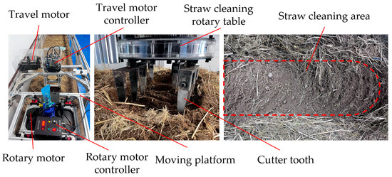 Based on the mode of operation, devices designed for clearing straws can be primarily categorized into two types: passive and active. Passive devices, such as disc-type stubble cutters, rely on the forward motion of the machine to operate. They have a relatively simple structure and perform excellently when the amount of crop residue is moderate, making them the mainstream choice in many regions around the world [10,11]. However, when there is a large amount of straw residue and strong toughness, such devices are prone to issues like clogging. For instance, the residue cleaning disc developed by Kumar et al. has exhibited a residue removal rate between 70.52% and 75.94% in no-till corn stalk fields. However, the straw removal rate in the original paddy fields containing rice stalks is comparatively lower, ranging from 40.12% to 45.88% [12]. Conversely, the active straw cleaning apparatus operates through the application of supplementary power, exhibiting enhanced efficacy in the removal of residues. Aikins noted that the active device is capable of functioning efficiently without clogging in conditions where straw quantities reach up to 9000 kg per hectare [13]. Based on the rotational orientation of the cutter shaft, the active straw cleaning device can be categorized into two distinct types: horizontal rotation and vertical rotation. The cutter shaft of the horizontal rotary apparatus is oriented parallel to the ground, resulting in enhanced efficiency in stubble clearance. For instance, researchers Hou [14] and Yao [15] have both focused on attaining a high-definition straw rate; the designed horizontal rotary straw cleaning apparatus attains a straw cleaning rate exceeding 90%. However, this type of equipment tends to throw up and mix a large amount of soil during operation, which can cause serious clay-related problems, especially in wet, sticky soil conditions [16]. In relation to this matter, Liu et al. undertook optimization studies aimed at preventing adhesion on the cutter shaft [17]; this indirectly highlights the operational constraints of the horizontal rotary straw cleaning apparatus when utilized in environments characterized by wet and adhesive soil conditions. The vertical rotary straw cleaning device is characterized by a cutter shaft positioned orthogonally to the horizontal plane. The implementation of reciprocating soil cutting methods results in a significant reduction in soil disturbance. For example, Feng et al. designed a vertical rotary-type rotating cutter specifically for corn stubble, where the rate of soil disturbance was limited to 18.56% [18]. Nevertheless, the motion path of the device’s cutter teeth tends to redirect the straw onto the seeding belt that has already been cleared, and this leads to a generally low efficiency in the removal of straw. Wei et al. [19] explored the interaction mechanism of vertical rotary tillage operations on the effectiveness of rice straw removal. The optimized device achieved a straw removal rate of 81.95%, which is significantly lower than the performance of the horizontal rotary device [19].