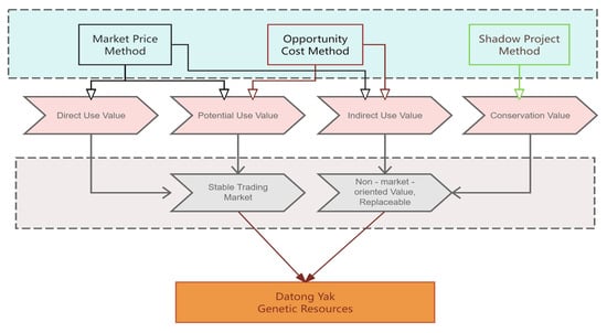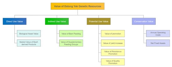 | Datong Yak (Cultivated) | Qinghai–Tibet Plateau | CNY 2.505 billion (Total) | 20.72%/7.10%/65.67%/6.51% | Genetic potential (PUV) | This study |