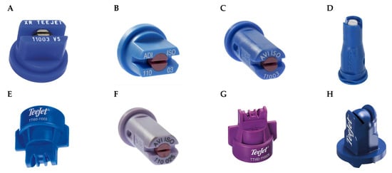 Flat-fan nozzles used in this study, corresponding to those described in Table 2. XR 110 03 (A), ADI 110 03 (B), AVI 110 03 (C), ID3 120 03 (D), TTI60 110 03 (E), AVI 110 025 (F), TTI60 110 025 (G), APTJ 110 03 (H).