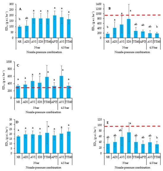 ED90 responses (with standard errors) of cotyledon (A,C,D) and 2-leaf (B,E) stage plants of C. album to bentazon (A,B), phenmedipham (C), and tembotrione (D,E) applied with various nozzle-pressure combinations. No significant differences (p < 0.05) between bars sharing a common letter (based on computed selectivity indices and corresponding p-values). The red dotted line represents maximum authorized field dose in Belgium.