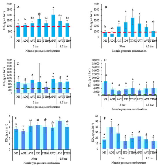 ED90 responses (with standard errors) of 2-leaf (A,C,E) and 4-leaf (B,D,F) stage plants of E. crus-galli to cycloxydim (A,B), nicosulfuron (C,D), and tembotrione (E,F) applied with various nozzle-pressure combinations. No significant differences (p < 0.05) between bars sharing a common letter (based on computed selectivity indices and corresponding p-values). The red dotted line represents the maximum authorised field dose in Belgium.