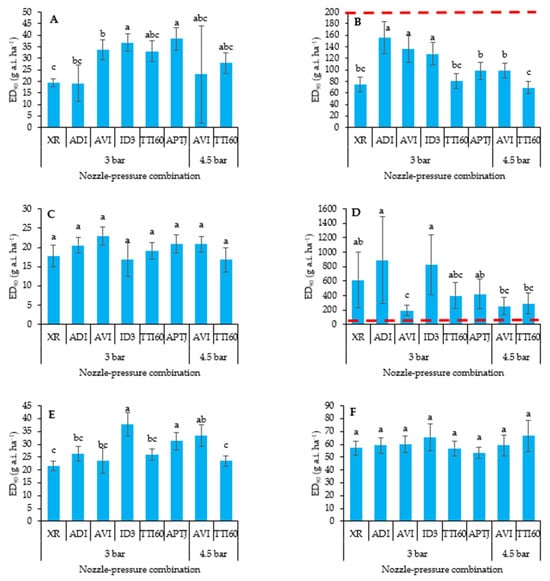 ED90 responses (with standard errors) of cotyledon (A,C,E) and 2-leaf (B,D,F) stage plants of S. nigrum to bentazon (A,B), phenmedipham (C,D), and tembotrione (E,F) applied with various nozzle-pressure combinations. No significant differences (p < 0.05) between bars sharing a common letter (based on computed selectivity indices and corresponding p-values). The red dotted line represents maximum authorized field dose in Belgium.