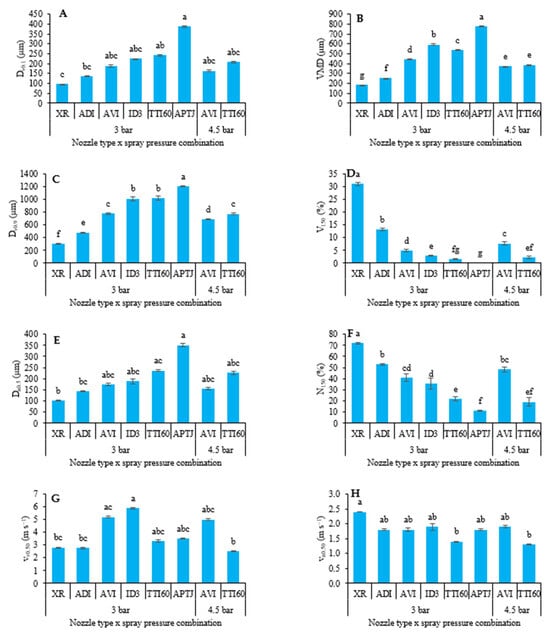 Droplet characteristics (mean ± SE) for all used nozzle type × spray pressure combinations: Dv0.1, VMD = Dv0.5, Dv0.9 (the sizes below which 10%, 50%, and 90% of the total droplet volume are contained; (A–C)), V150 (the percentage of the spray volume contained in droplets with a diameter below 150 μm; (D)), Dn0.5 (50% of the total number of droplets is smaller than this value; (E)), N150 (the percentage of droplets smaller than 150 μm; (F)), vv0.50 (droplet speed below which 50% of the total droplet volume is contained; (G)), vn0.50 (droplet speed of 50% of the droplets is slower than this value; (H)). Within droplet characteristics, there are no significant differences (p < 0.05) between values sharing a common letter.