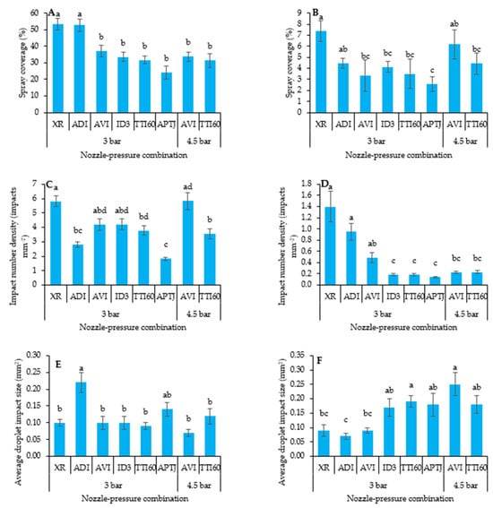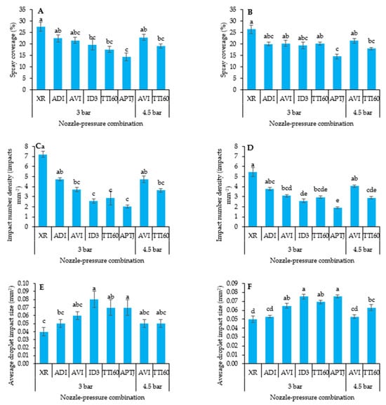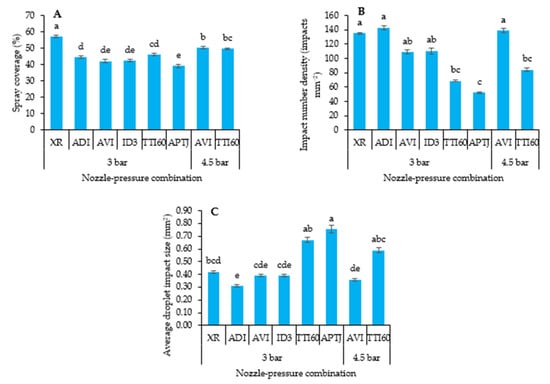 Spray coverage (%, A), impact number density (impacts mm−2, B), and mean droplet impact size (mm2, C) on water-sensitive paper for the tested nozzle type × spray pressure combinations (mean ± SE), all at 240 L ha−1. Means without a common letter are significantly different (p < 0.05).