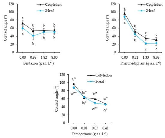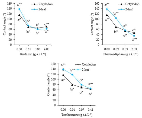 The contact angles (°, mean ± SE) of sessile spray droplets on the cotyledon and second true leaf of C. album as a function of the concentration of bentazon, phenmedipham, and tembotrione. Within each herbicide × stage combination, means without a common letter are significantly different (p < 0.05). Within each herbicide-dose combination, means with different numbers of asterisks are significantly different. X-axis is not linear.
