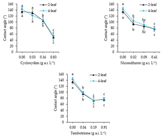 The contact angles (°, mean ± SE) of sessile spray droplets on the second and fourth true leaf of E. crus-galli as a function of the concentration of cycloxydim, nicosulfuron, and tembotrione. Within each herbicide × stage combination, means without a common letter are significantly different (p < 0.05). No effect of stage was observed. X-axis is not linear.
