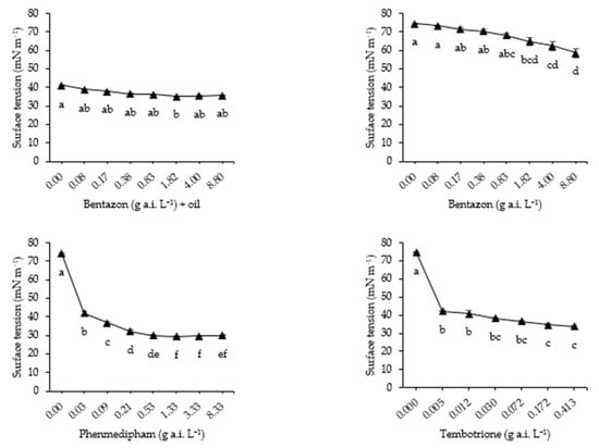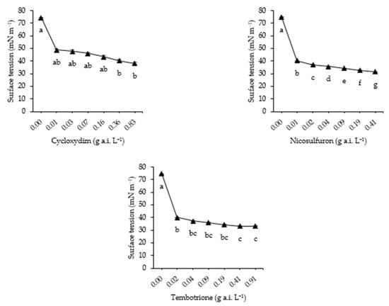 Surface tension (mN m−1, mean ± SE) as a function of concentration of the systemic herbicides cycloxydim, nicosulfuron, and tembotrione (bioassays with E. crus-galli). Means within a herbicide without a common letter are significantly different (p < 0.05). X-axis is not linear.
