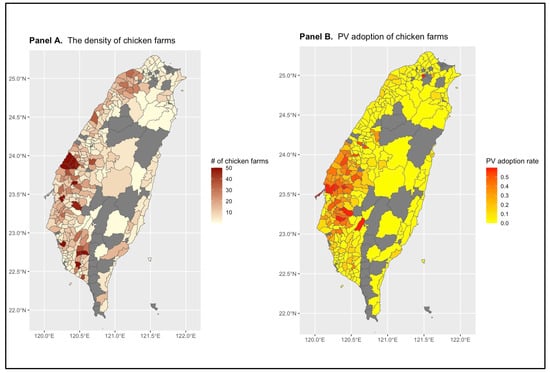 (A) The geographical distribution of chicken farms in Taiwan; (B) The geographical distribution of the PV adoption rate for chicken farms in Taiwan. Note: Both (A,B) are measured at the township level. # indicates the number. Darker-shaded regions indicate a higher quantity (or proportion) of chicken farms, while light gray areas represent regions with no chicken farms. The X-axis represents longitude, and the Y-axis represents latitude. Source is our sample drawn from DGBAS.