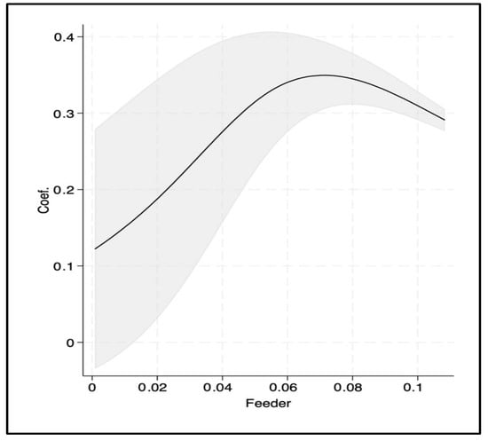In Column (2) of Table 2, we report both the coefficients and marginal effects estimated from first stage DR model. The key advantage of the DR approach is its ability to flexibly capture the nonlinear relationship between the feeder lines (i.e., the instrumental variable) and the likelihood of PV adoption. We report the estimated relationship between these two variables in Figure 2 using the nonlinear logit model. Our findings indicate that a farmer’s probability of adopting PV increases with feeder line density, and the maximum PV adoption rate is reached when there are 0.06 feeder stations per capita in a township. The association between other explanatory variables and PV adoption is qualitatively consistent with the OLS estimates. In general, we find that larger household size, younger and more highly educated farm operators, and longer working hours have a significant positive effect on PV adoption. Conversely, a higher male ratio, breeder chicken farming, and layer chicken farming exhibit a significant negative association with PV adoption. Meanwhile, farm size, operator gender, and colored broiler farming do not show any significant effect.
