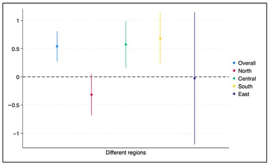 We further look into the heterogeneous effect among different regions. Figure 3 illustrates the estimated effects of PV adoption on chicken farm sales revenue across different regions of Taiwan. Regional heterogeneity is evident: farms in the Southern region experience the largest gains (about 0.7), suggesting that favorable solar conditions or larger production scales may amplify the benefits of PV integration. In contrast, the South shows more modest but still positive effects, while estimates for the North are close to zero and statistically insignificant. The East exhibits a positive point estimate, though the wide confidence interval crossing zero reflects high uncertainty, likely due to the limited number of observations in this region. These regional differences may be partly attributable to geographic and climatic conditions. In particular, the Central and Southern regions of Taiwan are characterized by relatively higher temperatures. For farms in these areas, PV adoption may generate additional benefits through shading effects that mitigate heat stress on poultry, thereby enhancing productivity and sales revenue beyond the direct gains from solar electricity generation.