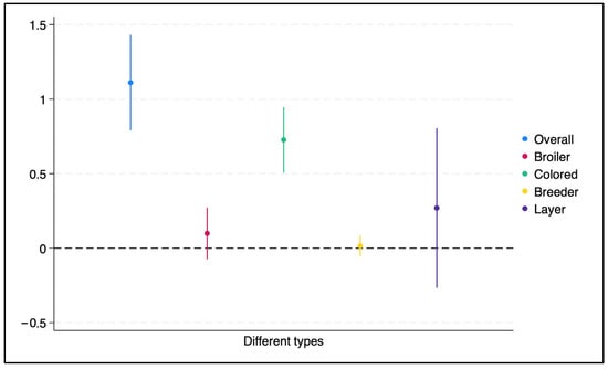 Panel C of Table 3 examines the effect of PV adoption on chicken production level by type of chicken. The results indicate that only colored broiler production experiences a significant increase in production quantity, with the magnitude of the effect equal to 7.9%, while no significant associations are found among commercial broilers, layer chickens, or breeder chicken farms. Figure 4 summarizes these results with confidence intervals and provides a comparison with the overall effect reported in Panel A.