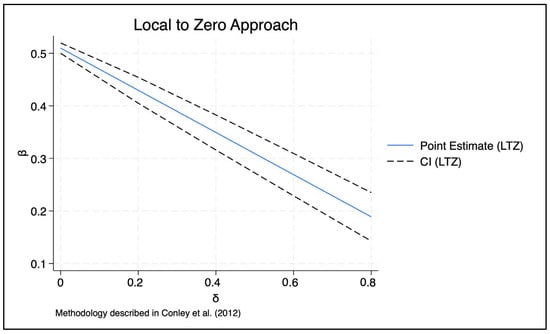 Since the identification strategy relies on the exogenous variable “feeder line,” it is necessary to test the plausibility of this assumption. Because the exogeneity restriction cannot be directly tested, the IV literature often employs simulation-based approaches to verify whether potential violations of the exclusion restriction threaten the robustness of the estimates. Following ref. [], we adopt the Local-to-Zero (LTZ) approach as a plausible-IV analysis to assess the sensitivity of our estimates. In simple terms, the logic of this sensitivity analysis is to relax the exclusion restriction gradually and observe how the estimated coefficients respond. If the estimates shift substantially or become statistically insignificant (e.g., include zero) as the restriction is relaxed, it suggests that the DR model may not be valid. Conversely, if the estimates remain stable and significant, this indicates the robustness of the identification strategy. Figure 5 presents the results of this exercise. The solid blue line shows the point estimate of the treatment effect under varying degrees of relaxation of the exclusion restriction, while the dashed lines indicate the corresponding 95% confidence intervals. As δ increases from 0 to 0.8, the estimated effect gradually declines but remains positive and statistically distinguishable from zero within the reported range. This suggests that even under moderate departures from the strict exogeneity assumption, our main findings are robust and the estimated benefits of PV adoption on sales revenue remain economically meaningful.